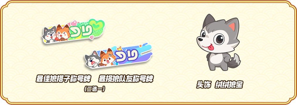 双人同行,默契领好礼,10月1日-10月13日,完成对应任务得狼人徽章,可兑换饰品 绒绒狼宝、最佳狼搭子称号牌和最损狼队友称号牌二选一,狼人币*100、百衣补贴抽奖券*20。