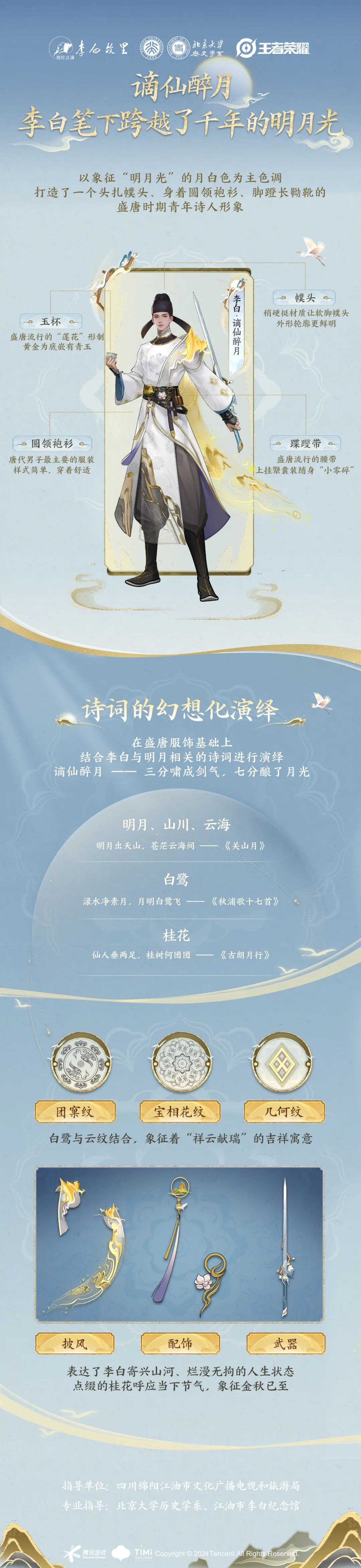 ◈ 服饰纹样:遵循唐朝服饰的特点,设计贴合李白仙气飘飘的“谪仙人”的身份,致敬李白的传统形象。