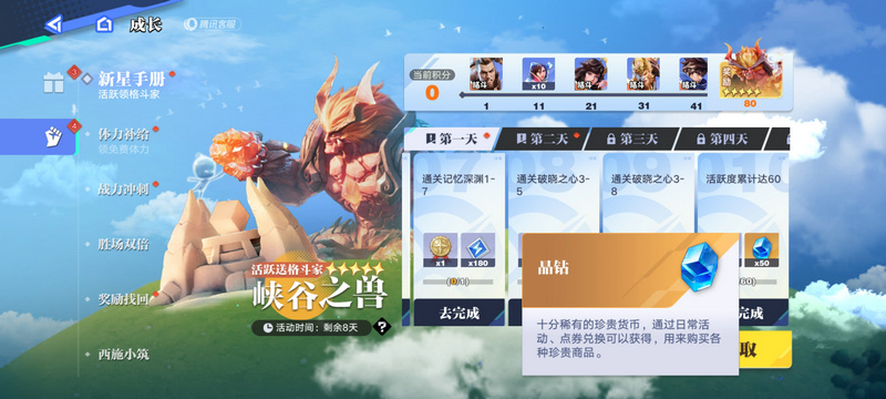 每天逛一逛系统预告和探索指南完成不同挑战也有大量晶钻可以领取。