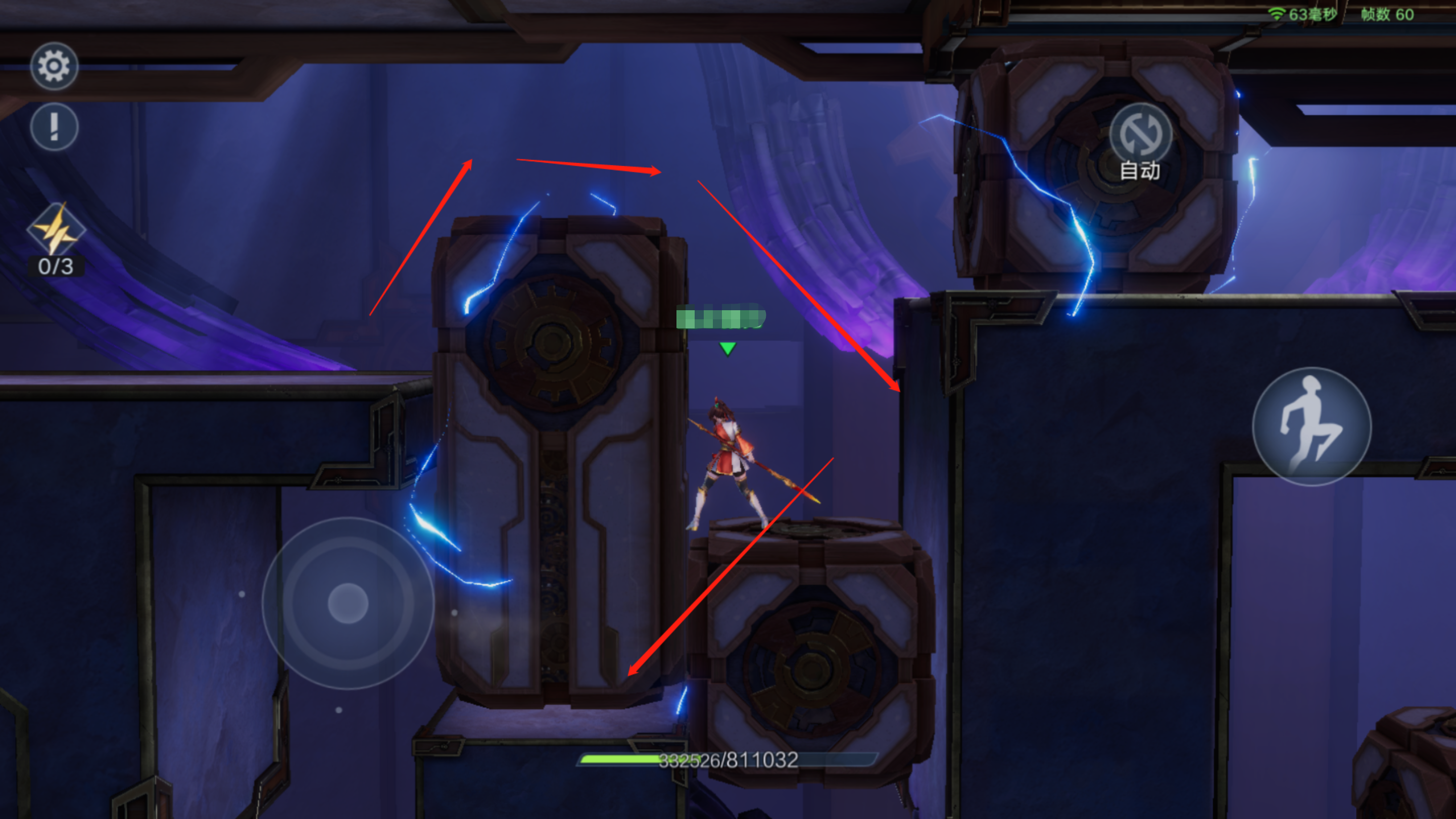 需要等地面的机关到达平台处,在上侧的机关移动的间隙按照箭头指示进行跳跃通过。要顺向机关移动轨迹跳跃,逆向跳跃会被正在移动的机关打断;