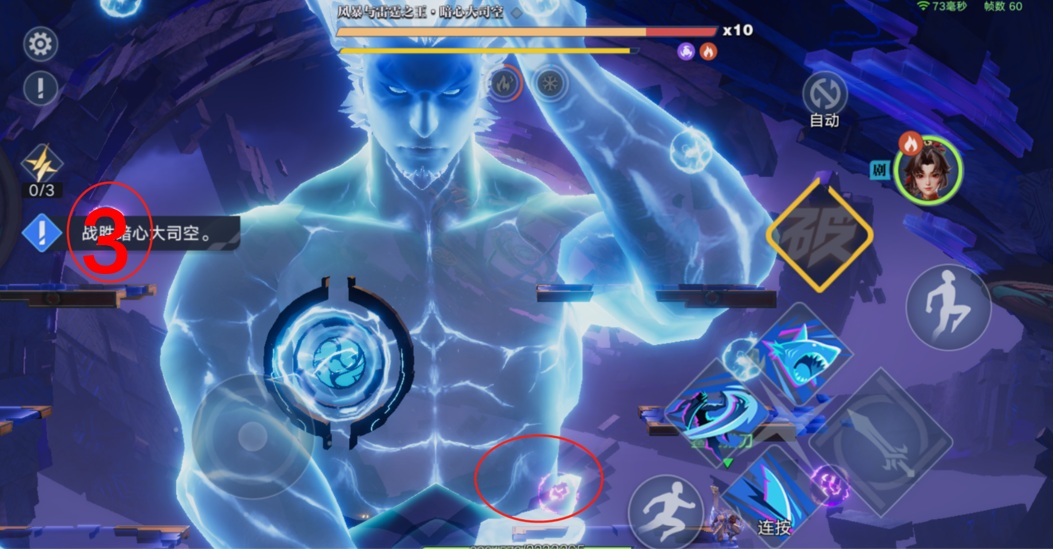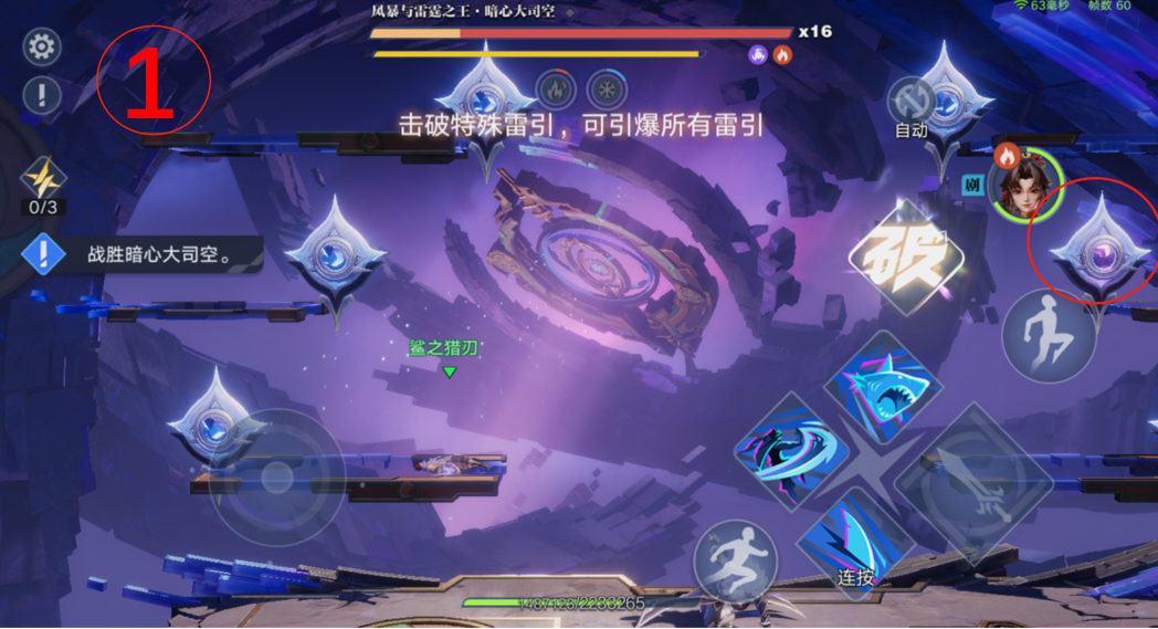 1、司空震第二形态登场时,左右两侧的浮台处会出现6个雷引,快速攻击紫色的雷引(见图1);