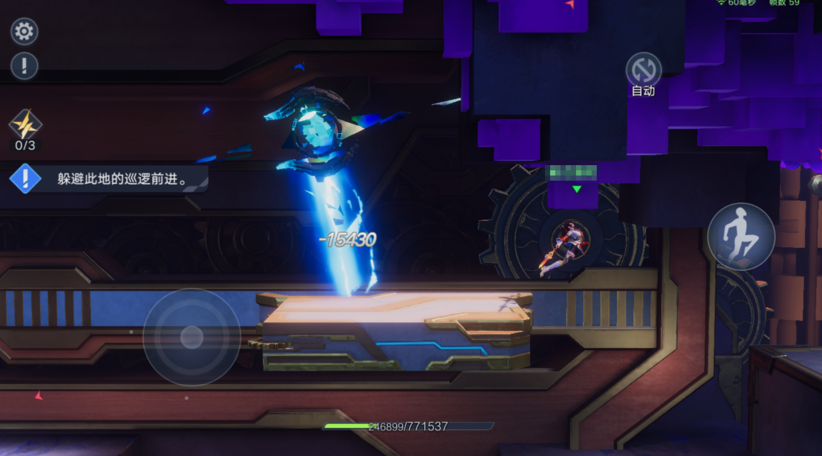 关卡中英雄处于附伤状态,利用死角躲避能量源的搜索视角,一旦被发现会被击飞,除了死角躲避以外,在左右视野能量源的正上方和正下方位置都可以巧妙躲避能量源的搜索视野;