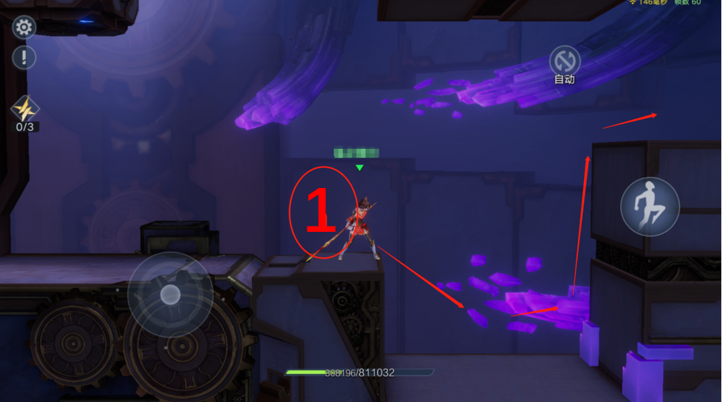 在看到白色大型机关时,先跳跃到“标记①”的位置,当机关展开时快速跳跃向箭头方向移动到“标记2”的暗心凹槽位中,停留在第二张图的方形夹角处躲避机关闭合的伤害,在方形机关上升时跳跃到达“标记3”的位置;