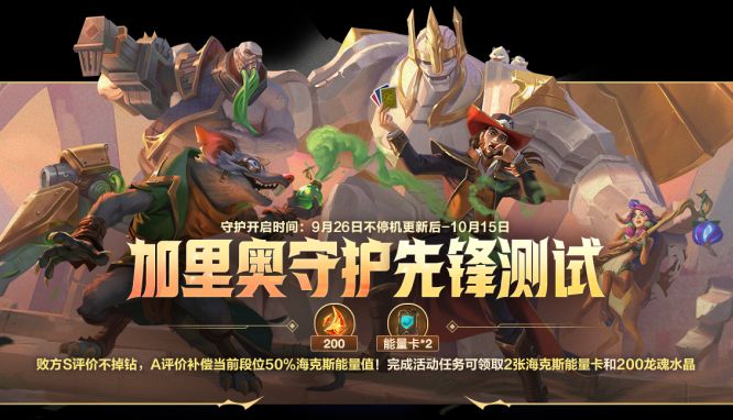 加里奥守护将于9月26日(明日)不停机更新后,开启限时测试!截止至10月15日,测试期间败方S评价不掉钻,A评价补偿当前段位50%海克斯能量值!9月26日(明日)至10月7日23:59分,召唤师完成3场排位赛即可领取海克斯能量卡*2与龙魂水晶*200奖励!
