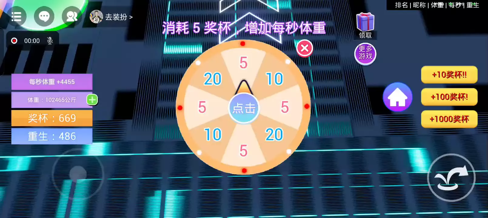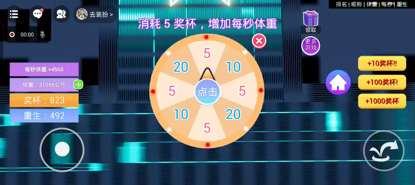 欢迎来到《体重模拟器》,每秒体重都会增加,跳下去踩塌楼板到达底部,获得奖杯。奖杯可以用来抽奖,增加每秒+。把你的体重截图到游戏圈分享吧~