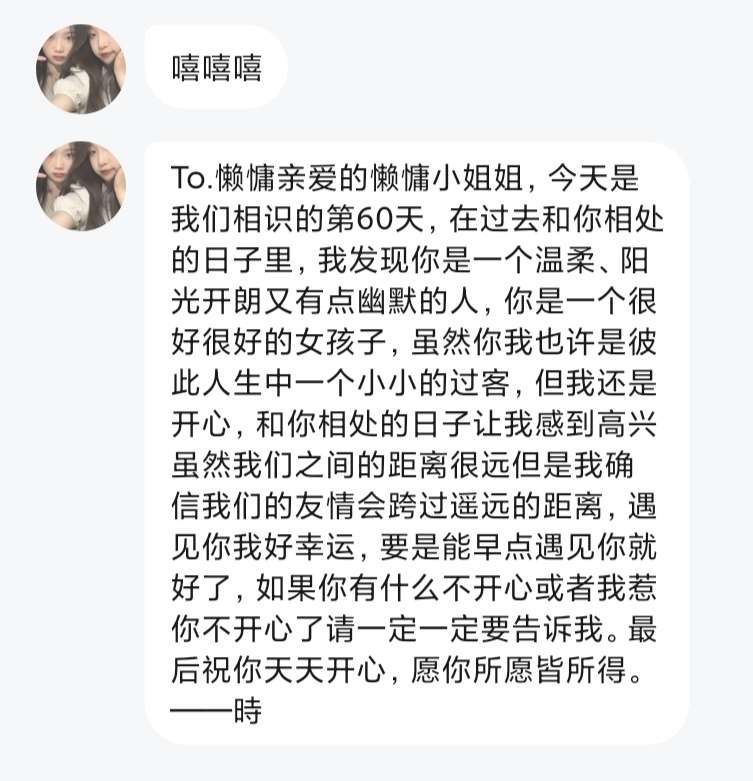 今天是我们在一起的第二个月,时间过得好快啊,你像我人生中的一束光。每天的早安晚安,一个多小时的语音通话都证明了你有多在乎我。我每天上晚自习没时间回你,你都不生气,我真的😭😭从广东到山东跨越几千多公里,但是我想说:距离不是问题,爱没学过地理——再次致敬我们的60天