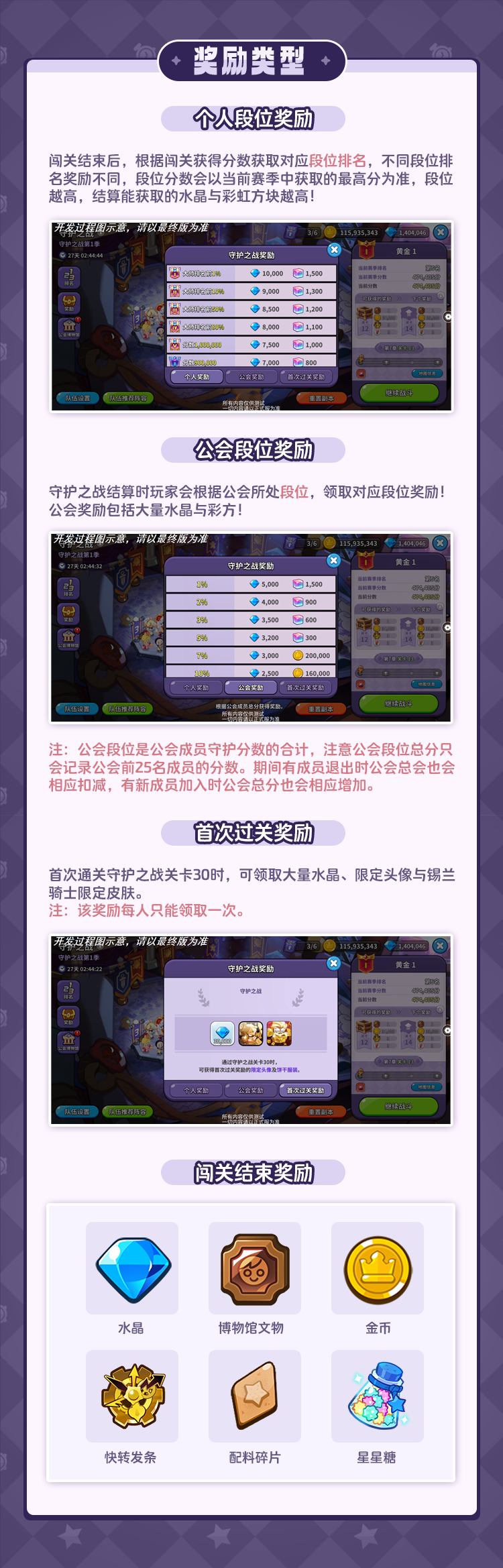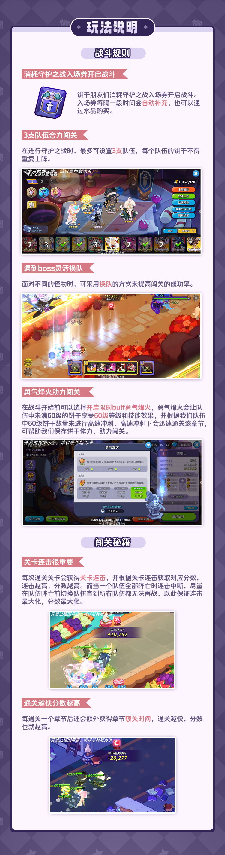 守护之战为常驻玩法,饼干朋友们可组建最多3支队伍参与章节战斗,战斗期间还可以进行阵容切换,来灵活应对不同地图怪物!每次通过章节都可以获取分数,在每轮战斗结束后,还能获得战斗奖励与文物奖励!