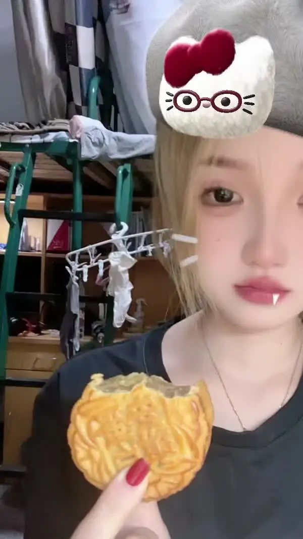 这是一则吃播内容,博主使用可爱的动物特效,在宿舍环境中进行进食展示,为大家呈现趣味吃播场景。