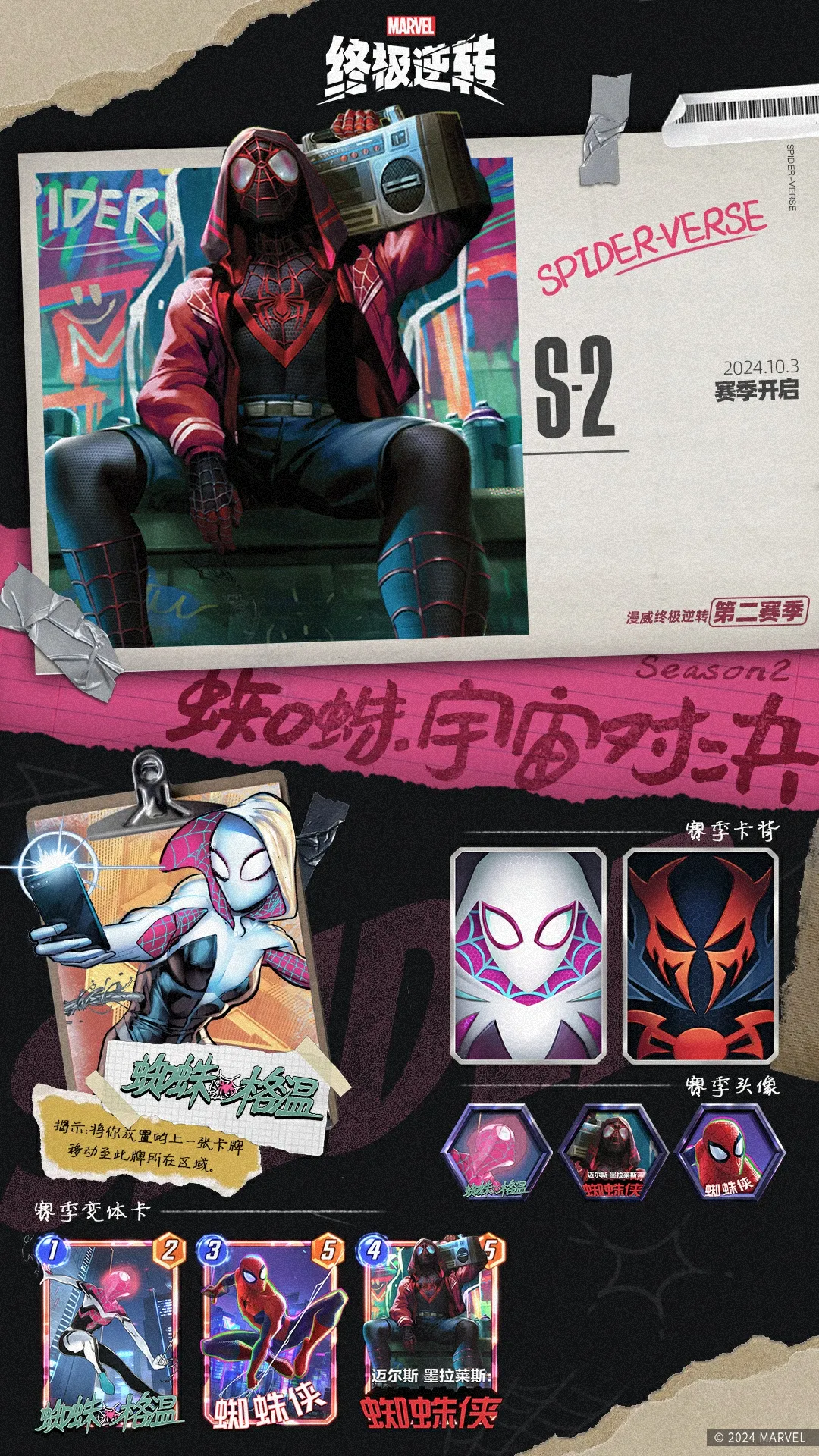S2赛季通行证——蜘蛛宇宙对决即将上线,特别加入了来自多元平行宇宙的蜘蛛侠,包括全新的角色——蜘蛛格温!随着赛季进行,您将有机会解锁全新卡牌、变体、头像和卡背,尽情享受在蜘蛛侠平行宇宙穿梭的刺激体验。