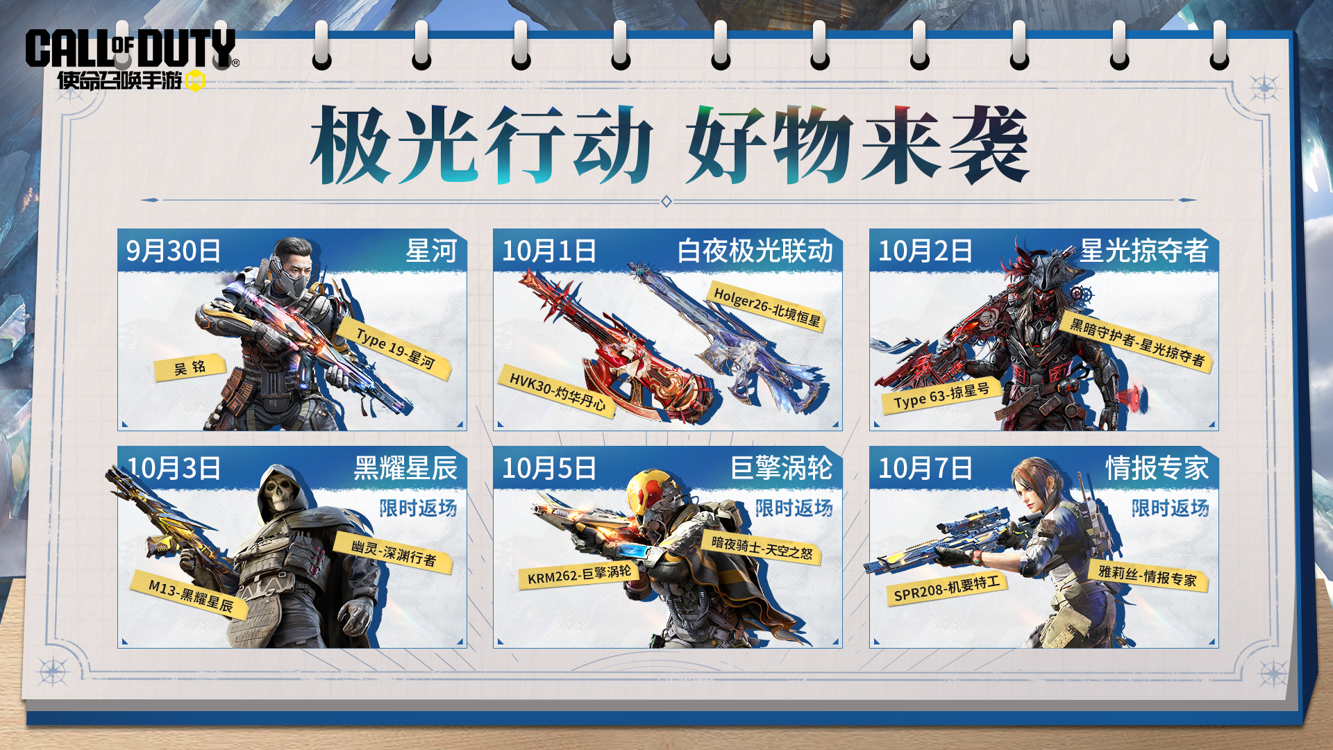 本次使命好物节将于9月30日(明天)正式开启,传说级武器Type 19-星河、白夜极光联动武器以及传说级角色黑暗守护者-星光掠夺者都会陆续抵达战场。