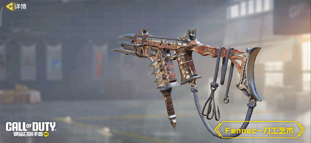 Fennec-刀工艺术的上下枪管,皆配有尖锐小刀,红木枪身上包裹着绘有复杂花纹的皮革,并捆绑着一排匕首,枪托尼龙绳的末端挂钩极为锋利,不怒自威。