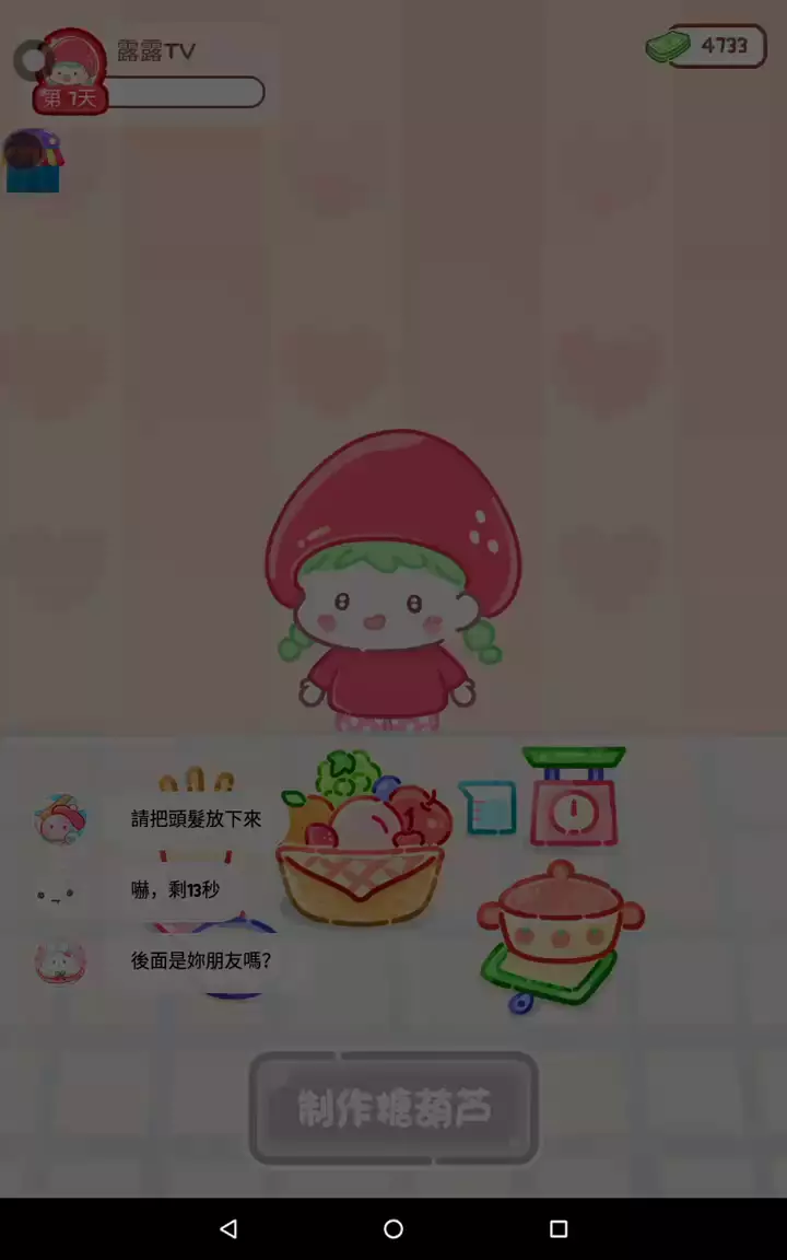 更新宠物!!! 「你进行草莓糖葫芦吃播的话,我就赞助100元。」 「脆口的声音太迷人了(°θ°)」 由于客人都被最近新开的许多糖葫芦店家抢走,曾经号称糖葫芦达人的父母因此卧病在床。 继承父母店面的主角露露开始糖葫芦吃播来宣传店面。 直到成为真正的糖葫芦达人那一天! 「今天我也要开始糖葫芦直播罗!( •o• )」 [串材料] 只有新鲜的水果的话,很难以一名吃播实况主存活下来。还要有松饼、地球软糖、青阳辣椒!利用奇特的材料制作糖葫芦吧。 [裹糖衣] 将材料串满竹签的话,就放进锅子搅动吧。唯有利用达人的秘法,才能裹出又薄又脆的糖衣。 [即时吃播] 咔哒咔哒!今天的吃播也大成功。热烈的聊天内容看起来反应也不错。看来得利用完成观众任务得到的赞助金来买新材料了! 来,准备好了吧?现在就马上挑战成为糖葫芦达人吧!