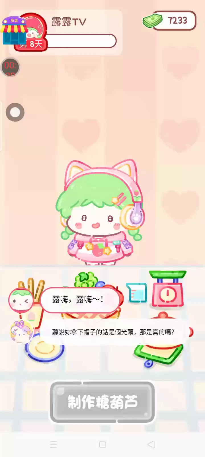 更新宠物!!! 「你进行草莓糖葫芦吃播的话,我就赞助100元。」 「脆口的声音太迷人了(°θ°)」 由于客人都被最近新开的许多糖葫芦店家抢走,曾经号称糖葫芦达人的父母因此卧病在床。 继承父母店面的主角露露开始糖葫芦吃播来宣传店面。 直到成为真正的糖葫芦达人那一天! 「今天我也要开始糖葫芦直播罗!( •o• )」 [串材料] 只有新鲜的水果的话,很难以一名吃播实况主存活下来。还要有松饼、地球软糖、青阳辣椒!利用奇特的材料制作糖葫芦吧。 [裹糖衣] 将材料串满竹签的话,就放进锅子搅动吧。唯有利用达人的秘法,才能裹出又薄又脆的糖衣。 [即时吃播] 咔哒咔哒!今天的吃播也大成功。热烈的聊天内容看起来反应也不错。看来得利用完成观众任务得到的赞助金来买新材料了! 来,准备好了吧?现在就马上挑战成为糖葫芦达人吧!