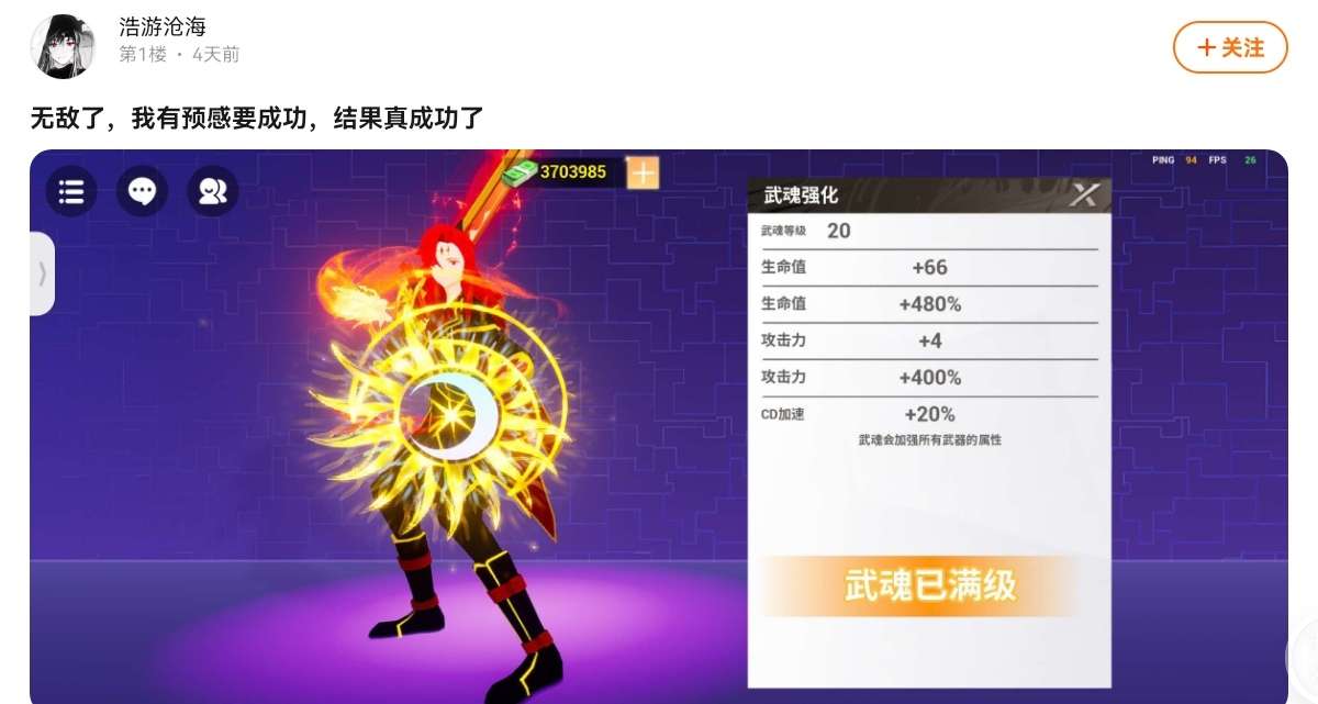 唐三满级武器属性:HP385,ATK16,暴击25%,CD+20%