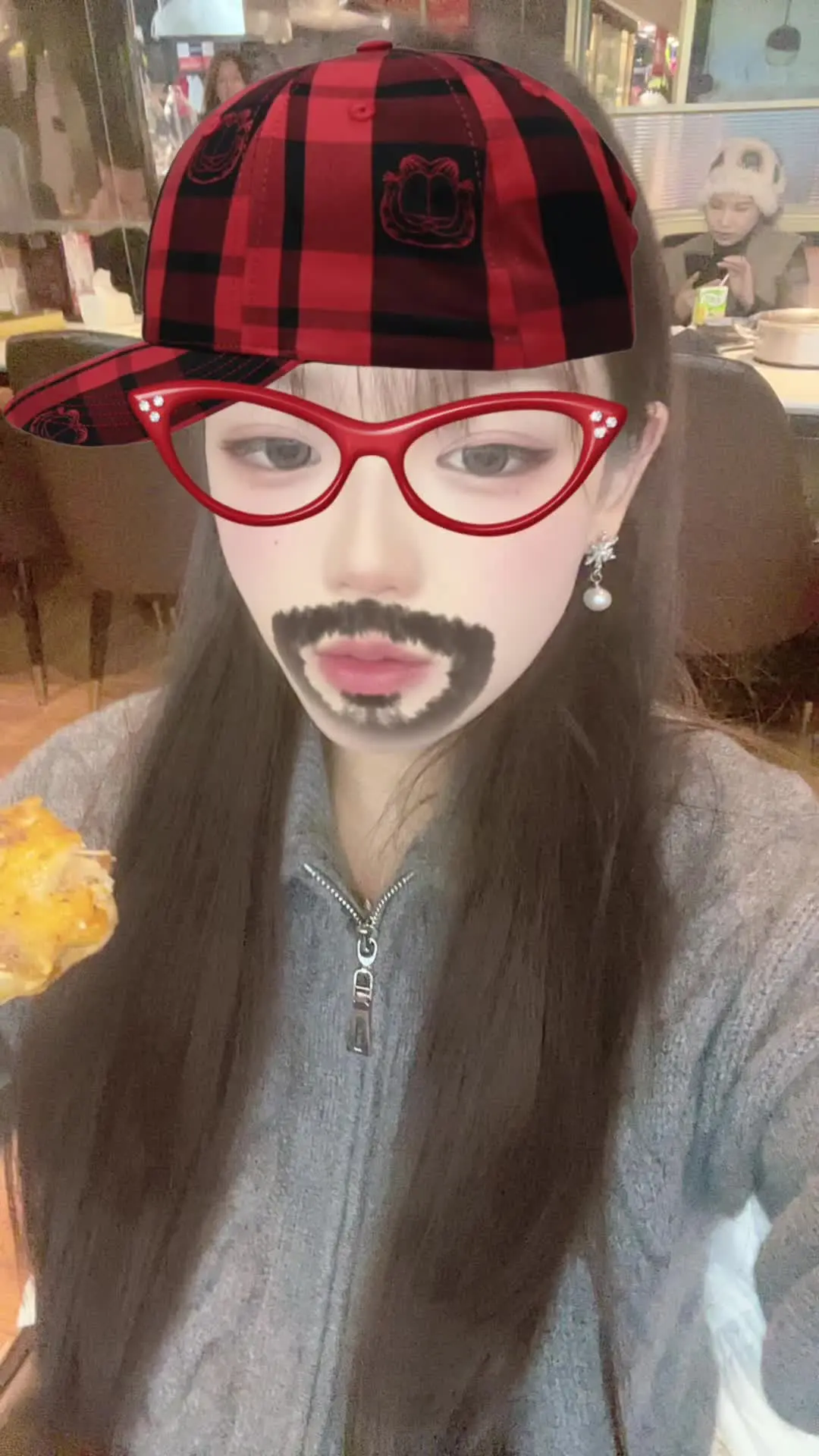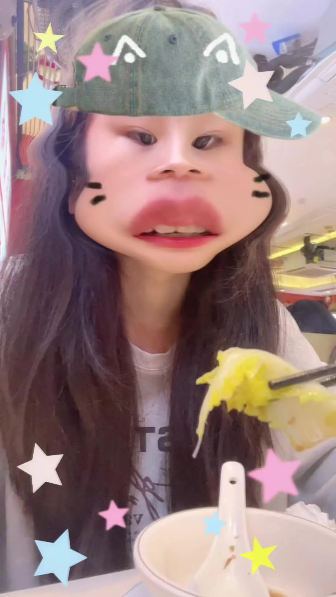 这是一则趣味吃播内容,两位女生借助搞怪特效,在镜头前互动进食,呈现出轻松欢乐的吃播场景,为大家带来充满趣味的美食分享。