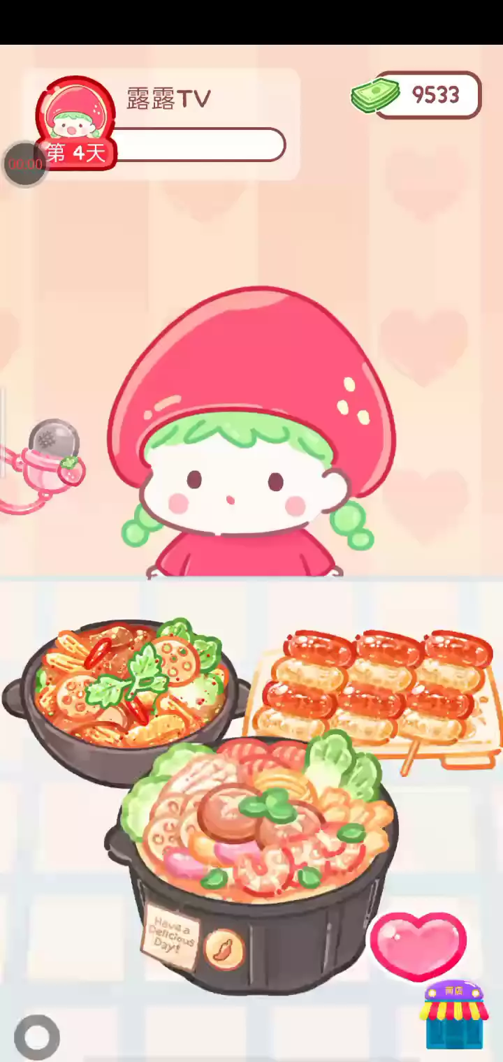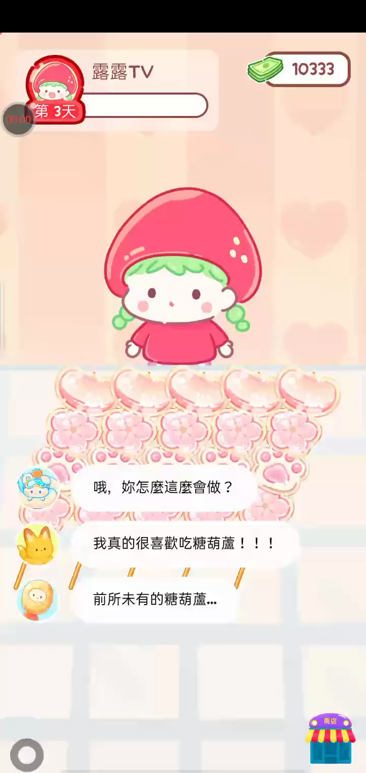 更新宠物!!! 「你进行草莓糖葫芦吃播的话,我就赞助100元。」 「脆口的声音太迷人了(°θ°)」 由于客人都被最近新开的许多糖葫芦店家抢走,曾经号称糖葫芦达人的父母因此卧病在床。 继承父母店面的主角露露开始糖葫芦吃播来宣传店面。 直到成为真正的糖葫芦达人那一天! 「今天我也要开始糖葫芦直播罗!( •o• )」 [串材料] 只有新鲜的水果的话,很难以一名吃播实况主存活下来。还要有松饼、地球软糖、青阳辣椒!利用奇特的材料制作糖葫芦吧。 [裹糖衣] 将材料串满竹签的话,就放进锅子搅动吧。唯有利用达人的秘法,才能裹出又薄又脆的糖衣。 [即时吃播] 咔哒咔哒!今天的吃播也大成功。热烈的聊天内容看起来反应也不错。看来得利用完成观众任务得到的赞助金来买新材料了! 来,准备好了吧?现在就马上挑战成为糖葫芦达人吧!