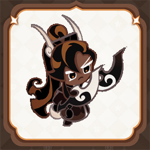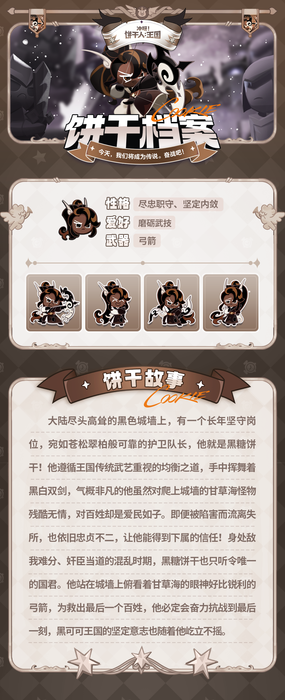 大陆尽头高耸的黑色城墙上,有一个长年坚守岗位,宛如苍松翠柏般可靠的护卫队长,他就是黑糖饼干!他遵循王国传统武艺重视的均衡之道,手中挥舞着黑白双剑,气概非凡的他虽然对爬上城墙的甘草海怪物残酷无情,对百姓却是爱民如子。他站在城墙上俯看着甘草海的眼神好比锐利的弓箭,为救出最后一个百姓,他必定会奋力抗战到最后一刻,黑可可王国的坚定意志也随着他屹立不摇。