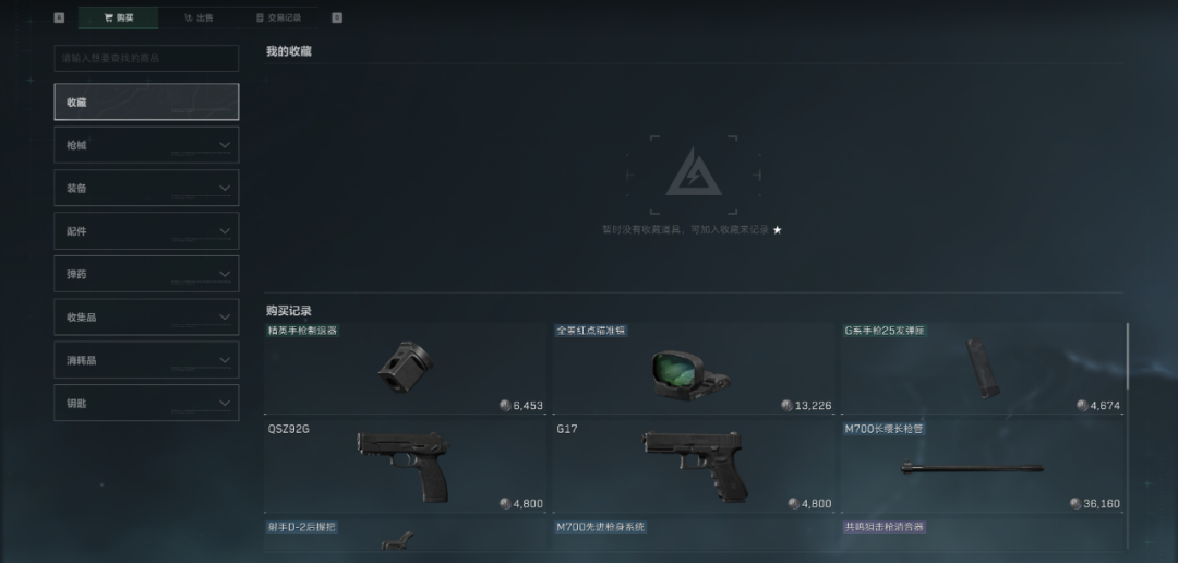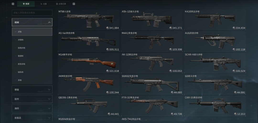 而每个大类下还会细分不同的物品类型,以枪械为例,这里会详细区分步枪、冲锋枪、狙击步枪等类别,方便大家快速导航至需要的类目。
