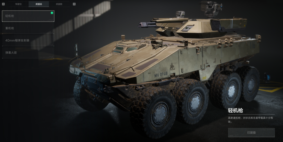 如LAV-AA防空车的武器站默认配备轻机枪,防止步兵的偷袭。也可改装成伤害更高的重机枪或反步兵的弹幕火箭提升效率。