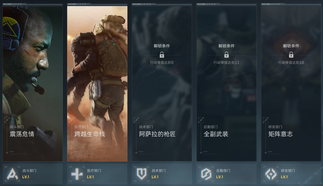 在之前的介绍中,我们知道特勤处共有5个部门。新手干员初期只能接取战斗部门及医疗部门的任务,随着行动等级提升,会逐渐解锁所有部门。