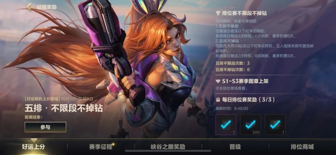 理论与实践结合,学完了米利欧峡谷第一课,召唤师们快上号看看实力~隆哥还有一则好消息:好运姐的上分霸福活动将于明日开启,活动期间召唤师每日可获2次五排不掉钻的机会,大家千万不要错过啦!