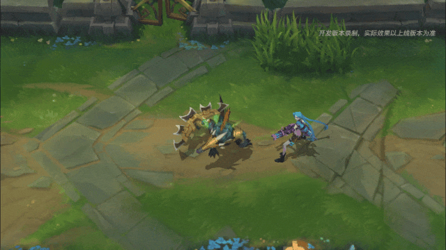 雷克顿身上闪烁绿色亮光,手中弯刀霎时变为金红色,更显威严。雷克顿抬手挥动弯刀强化下次普攻以造成2次连击,击晕目标并造成伤害,命中敌人时会在其头顶附加“眩晕”图标效果。