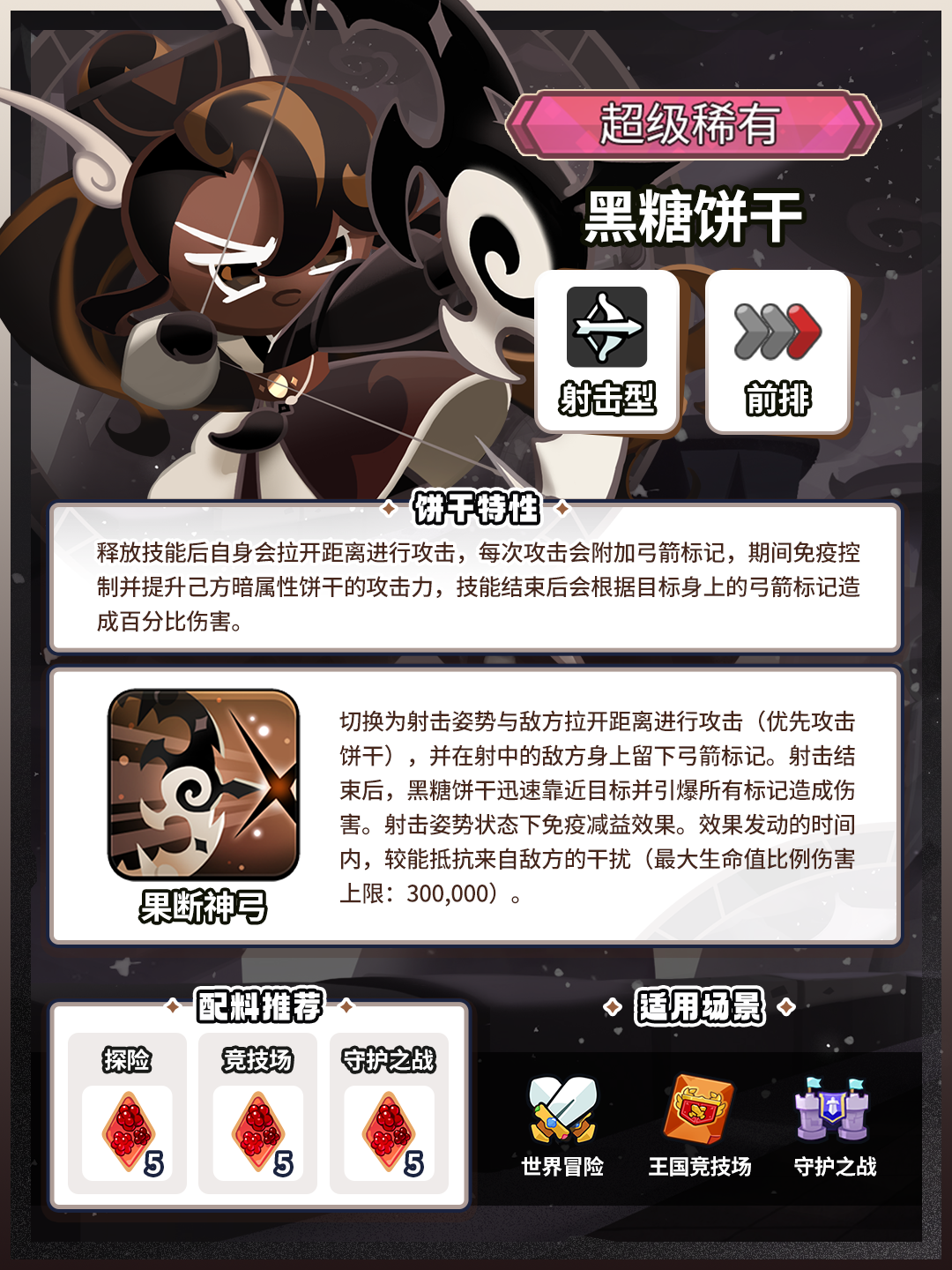 释放技能后自身会拉开距离进行攻击,每次攻击会附加弓箭标记,期间免疫控制并提升己方暗属性饼干的攻击力,技能结束后会根据目标身上的弓箭标记造成百分比伤害。