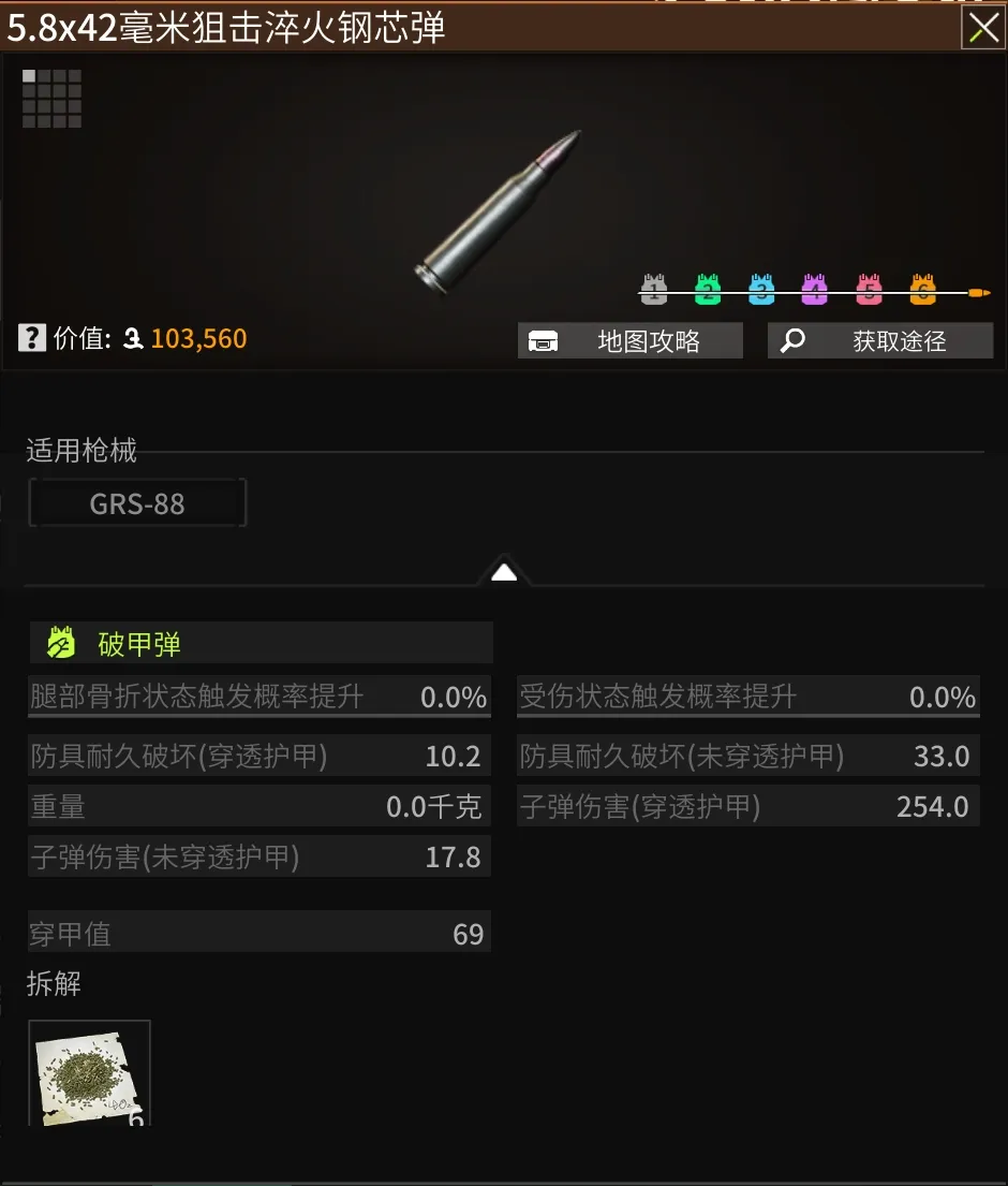 正所谓,好马配好鞍,一把好枪也需要配上好弹药!GRA-192与GRS-88都使用的是5.8×42mm弹药,该弹药拥有超强的穿透力!6965穿甲值让其他弹药望尘莫及,面对目前的六级甲这个数值都是过穿的!