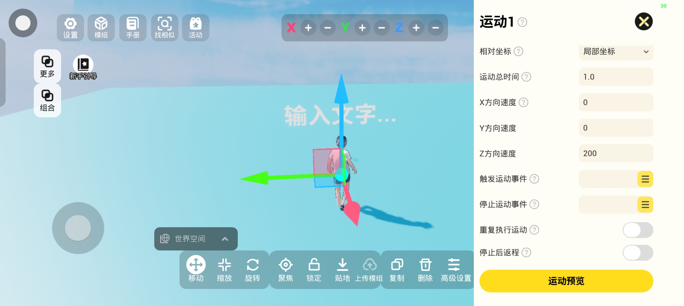 运动器的配置方法也不难,只需要点击文字的【高级设置】-【物理】-【添加运动器】-【运动1】,将【运动总时间】设为1(其实就是运动1秒的意思);将【Y方向速度】设为0,Z方向速度设为200;此时我们点击运动预览,会发现文字已经可以从地板下成功弹出啦!