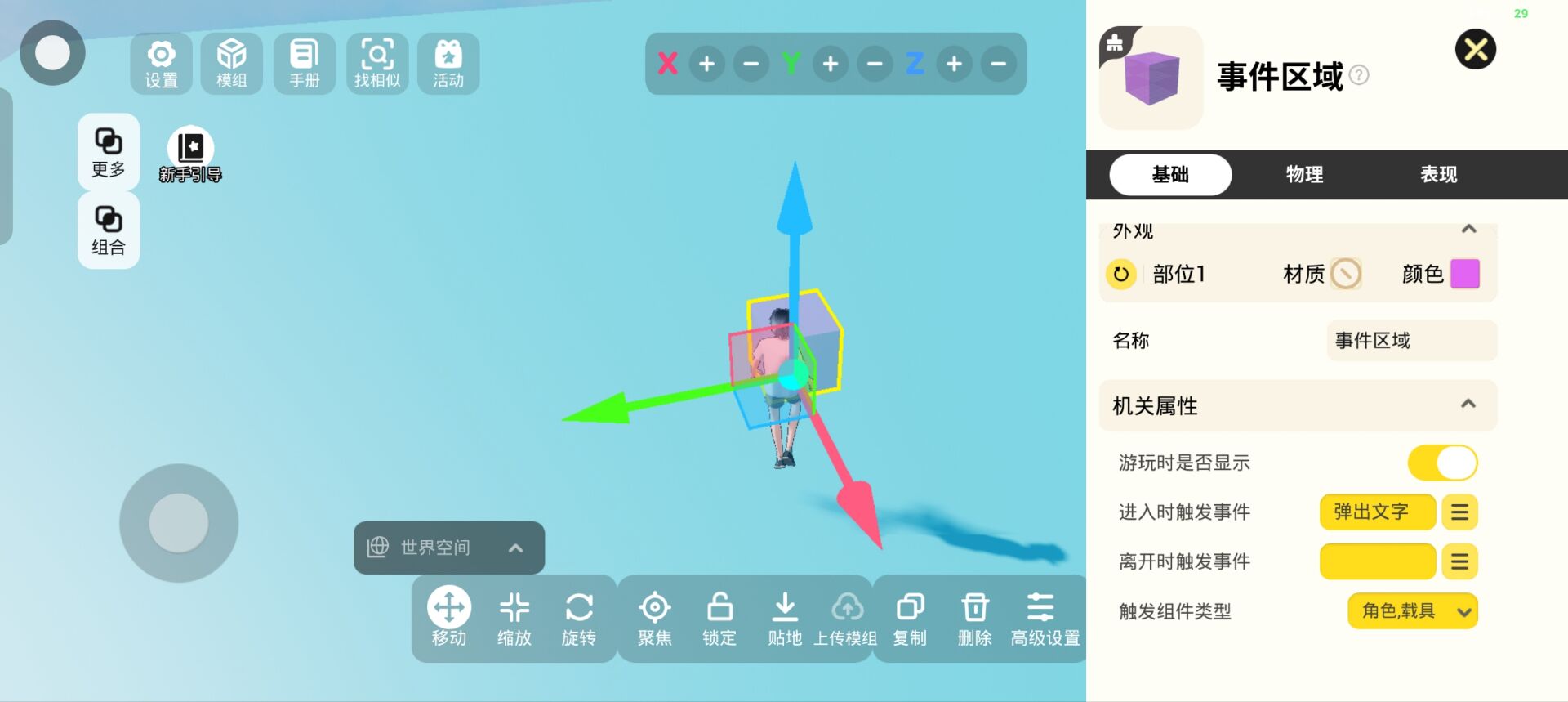 点击右侧功能栏的【机关】-【逻辑】-【事件区域】-【高级设置】-【基础】,为方便演示将【游玩时是否显示】打开,然后将【进入时触发事件】设为“弹出文字”,这样,当玩家进入事件区域时,就会触发“弹出文字”这个事件,就像下面这样: