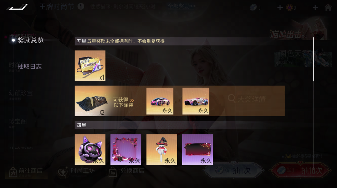 本期时尚节中,车手们每抽取240次,将必定获得五星奖励:时尚节门票或两款全新动态涂装,如首次获得的五星奖励为时尚节门票,则下次五星奖励必定为全新动态涂装*2,反之同理。