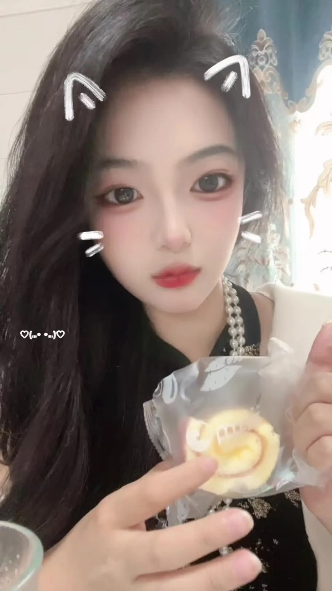 这是一则吃播内容,博主带着可爱的猫系特效,手持食物进行展示,风格复古,标注#梦回2016,呈现出轻松有趣的吃播场景。