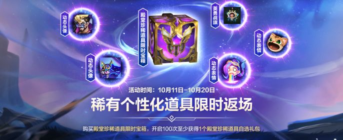 10月11日(明日)0点至10月20日,动态头像、动态表情等众多稀有个性化道具限时返场!召唤师可使用20点券购买殿堂珍稀道具限时宝箱,开启100次至少获得1个殿堂珍稀道具自选礼包~
