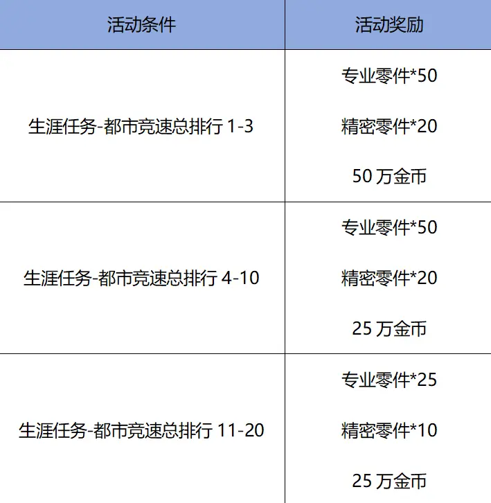 即日起参与挑战“生涯任务-都市竞速”关卡(“羊村”第二关),截止至10月16日中午12点,总排行榜单前20名的玩家将获得高阶改装零件及大量金币奖励。奖励将于10月16日发放。