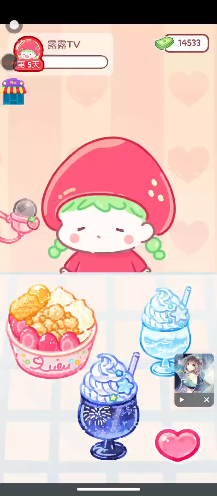 更新宠物!!! 「你进行草莓糖葫芦吃播的话,我就赞助100元。」 「脆口的声音太迷人了(°θ°)」 由于客人都被最近新开的许多糖葫芦店家抢走,曾经号称糖葫芦达人的父母因此卧病在床。 继承父母店面的主角露露开始糖葫芦吃播来宣传店面。 直到成为真正的糖葫芦达人那一天! 「今天我也要开始糖葫芦直播罗!( •o• )」 [串材料] 只有新鲜的水果的话,很难以一名吃播实况主存活下来。还要有松饼、地球软糖、青阳辣椒!利用奇特的材料制作糖葫芦吧。 [裹糖衣] 将材料串满竹签的话,就放进锅子搅动吧。唯有利用达人的秘法,才能裹出又薄又脆的糖衣。 [即时吃播] 咔哒咔哒!今天的吃播也大成功。热烈的聊天内容看起来反应也不错。看来得利用完成观众任务得到的赞助金来买新材料了! 来,准备好了吧?现在就马上挑战成为糖葫芦达人吧!