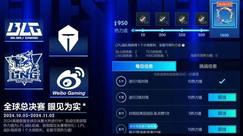 2024英雄联盟全球总决赛火热进行中!截止至11月2日,召唤师完成任务获取热力值为LPL战队助威,即可领取全球总决赛电竞个性化道具自选宝箱、S赛定制头像框-勇往直前 百炼成金和龙魂水晶等好礼。同时,LPL每获得1个大场胜利,全服可领热力值!