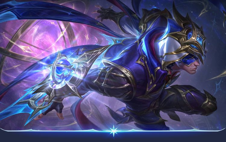 利刃出鞘,在暗夜中闪烁出神秘的蓝色光辉。泰隆掷出如星河一般的锥形匕首阵,对命中的目标造成伤害,匕首掷出范围末端时将幻化为蓝黄色十字匕首,伴随着星光闪耀,短暂停留后返回自身,对沿途命中的敌人造成伤害并减速。