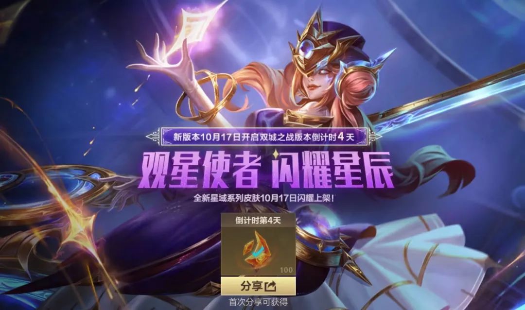 5.3新版本“双城之战”即将开启!观星使者,闪耀星辰。全新星域系列皮肤将于10月17日随版本更新闪耀上架!与此同时,召唤师今日前往游戏页面参与分享倒计时海报,即可获得龙魂水晶*100好礼~