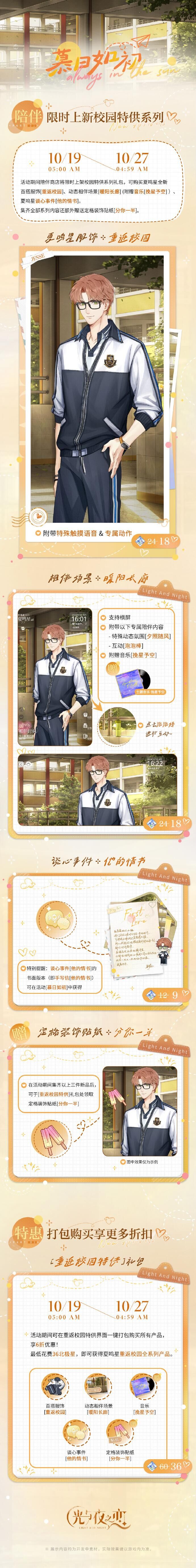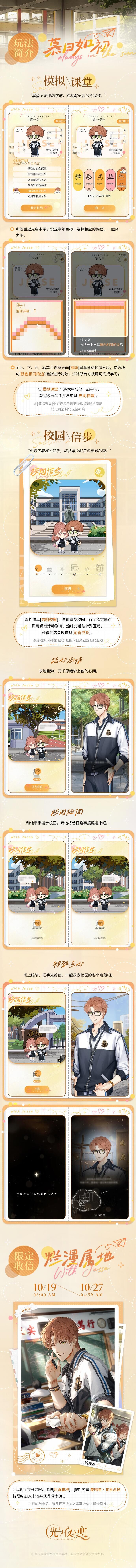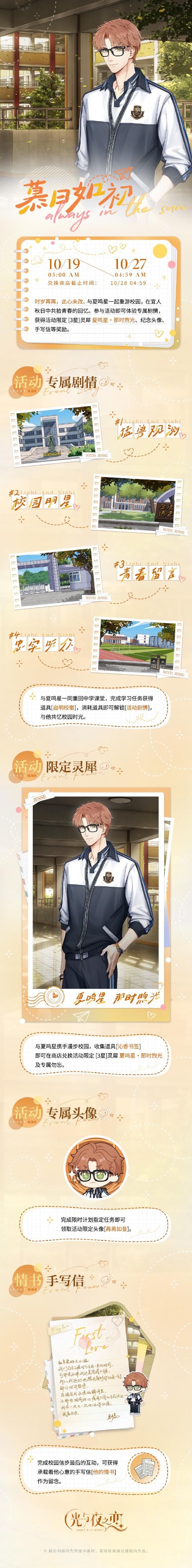 活动说明:时岁苒苒,此心未改。与夏鸣星一起重游校园,在宜人秋日中共拾青春的回忆。参与活动即可体验专属剧情,获得活动限定 [3星]灵犀 夏鸣星・那时煦光、纪念头像、手写信等奖励。