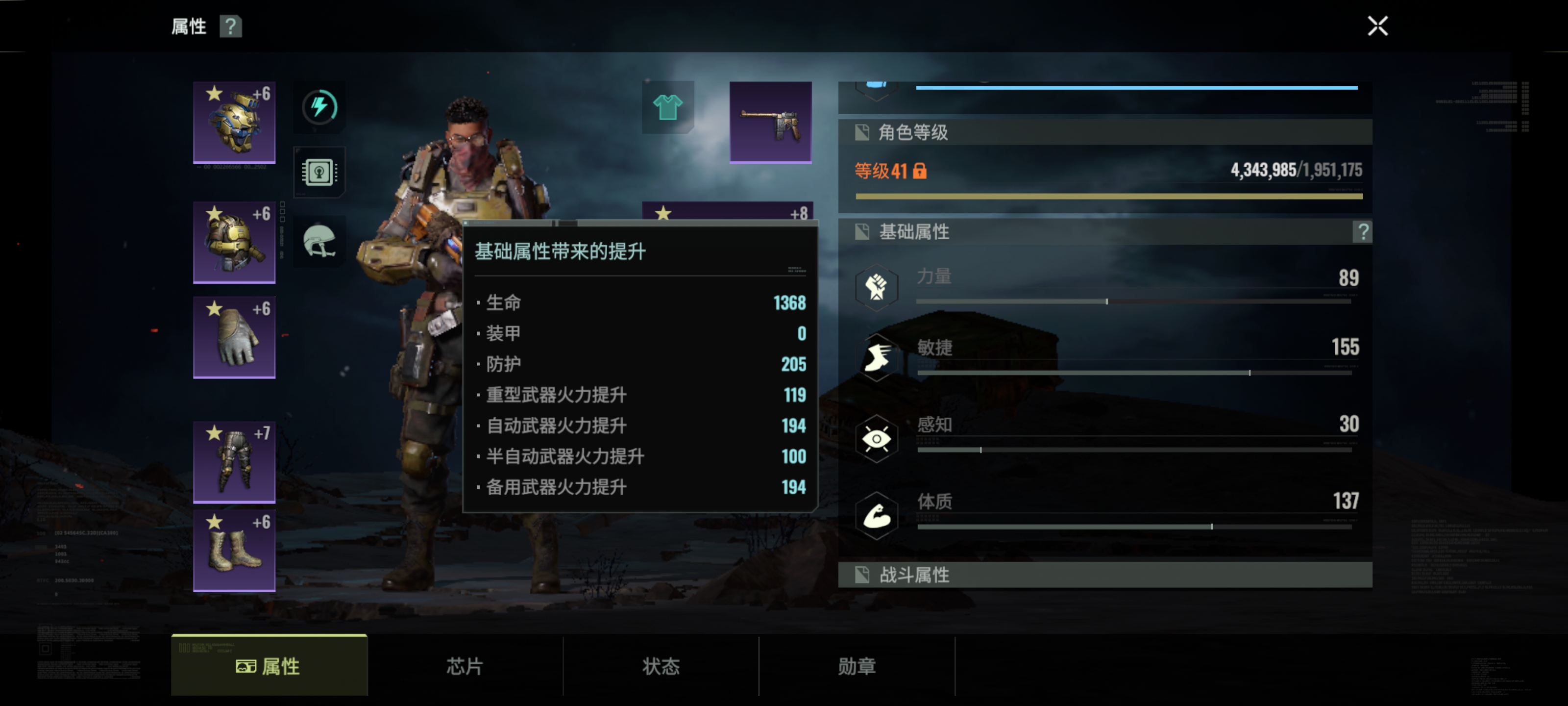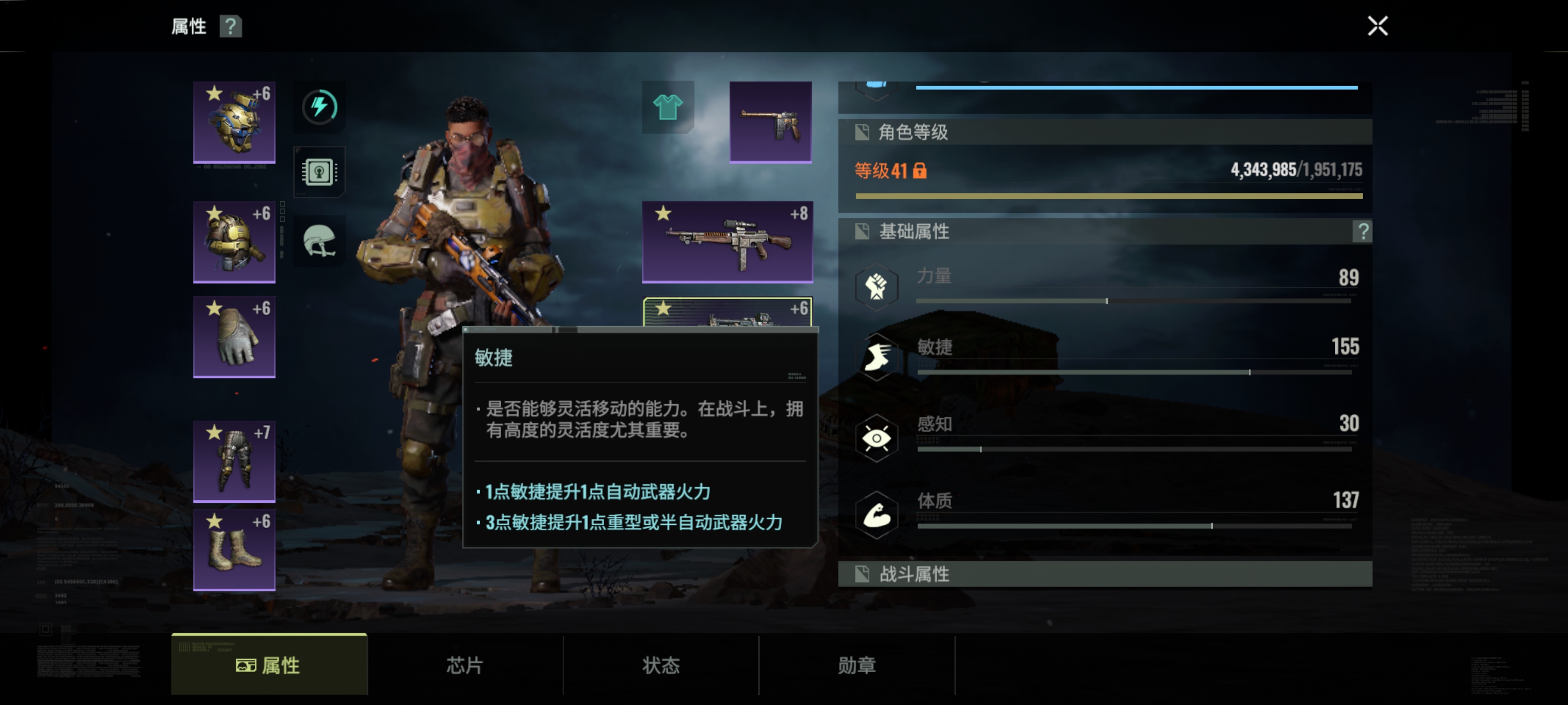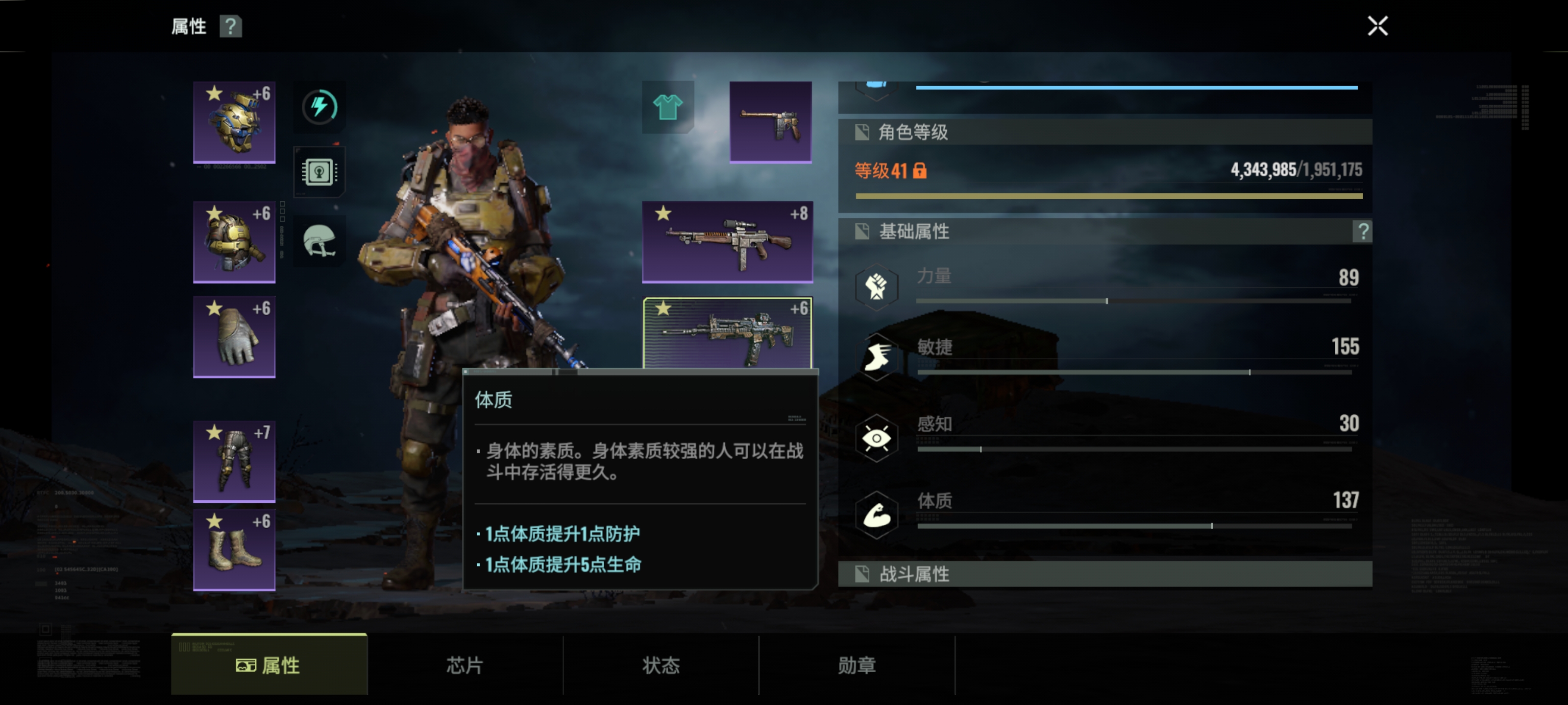 战斗属性有六种,分别是暴击率 暴击伤害 命中头部伤害 射速 暴击抵抗 头部受到伤害减免