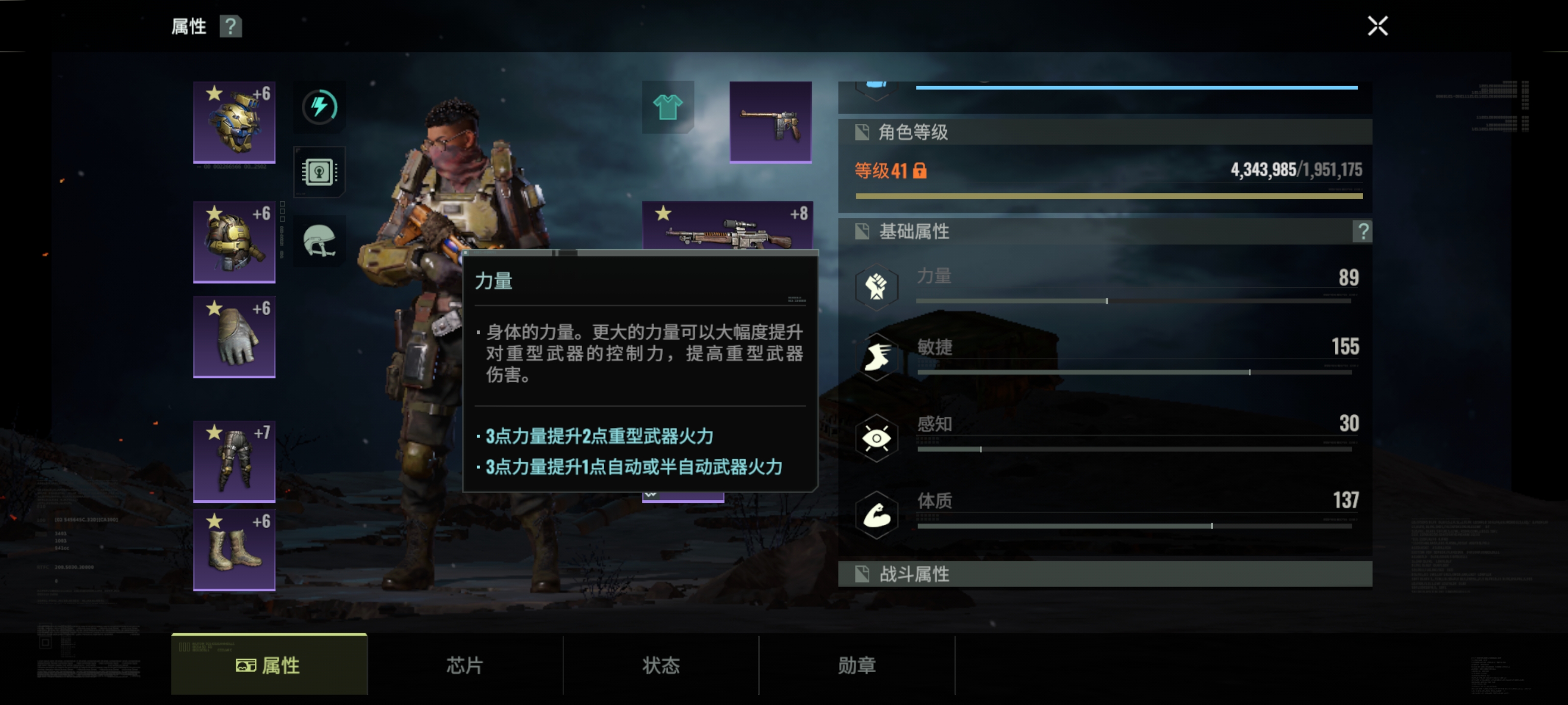 力量:主提升重型武器火力,副提升其他武器火力。