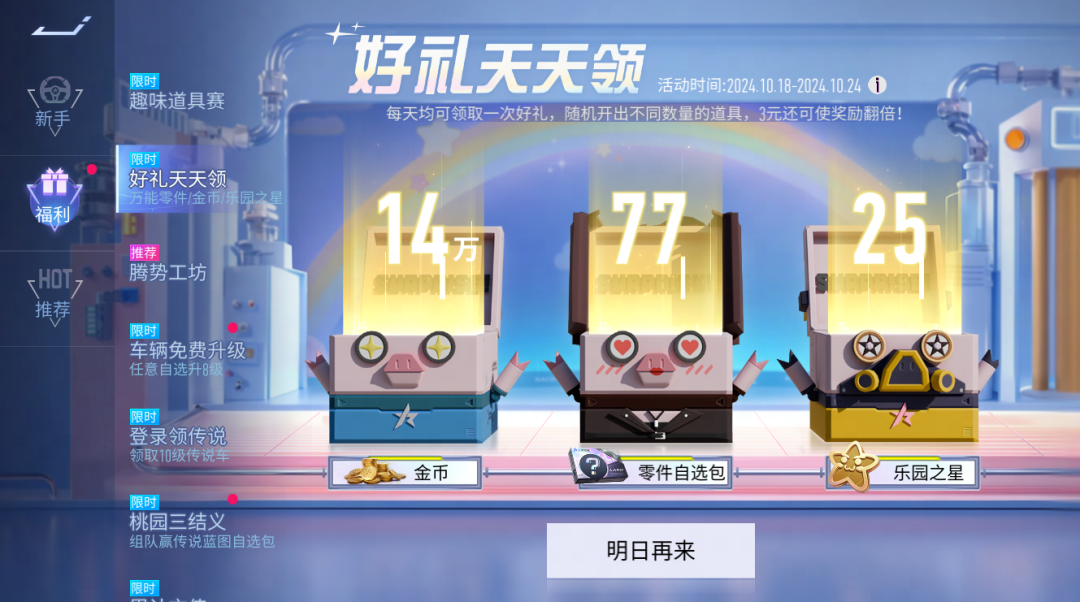 10月18日-10月24日,车手们每天仅需登录速度节即可前往“好礼天天领”活动界面免费领取一份道具礼包~道具礼包内含随机数量的金币、零件自选包以及乐园之星好礼(打开零件自选包后可以选择获得1个已有的黑金会员车及补给卡池车对应的零件)。