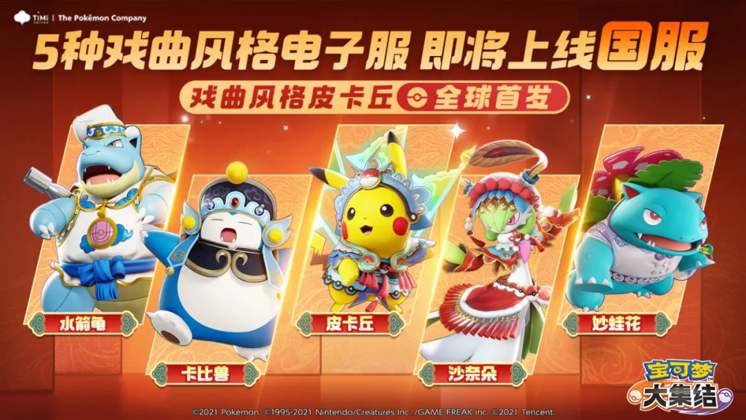 除了新玩法,还有新电子服等训练家们来拿——皮卡丘、妙蛙花、水箭龟、沙奈朵、卡比兽5只宝可梦的【戏曲风格电子服】即将上线国服,其中,戏曲风格皮卡丘电子服是全球首发哦!