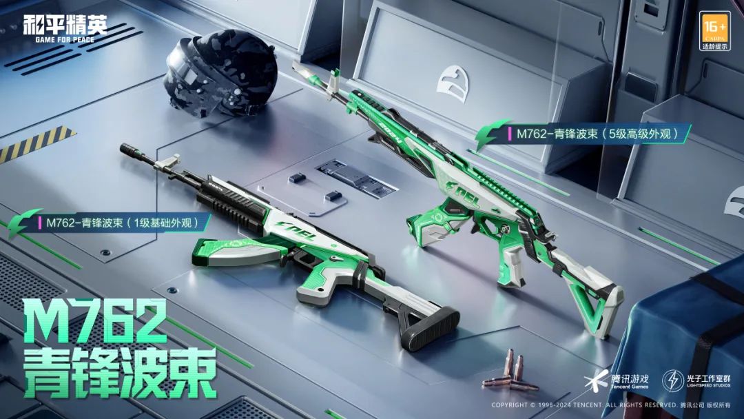 10月16日,M762-青锋波束全新枪皮肤即将上线!淡绿的枪身搭配银色的描边,为战场注入了新的活力!