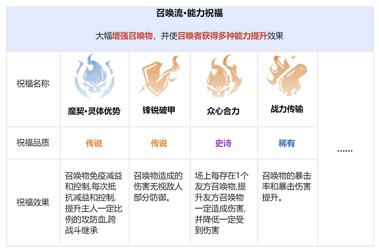 祝福分为珍稀、史诗、传说三种品质