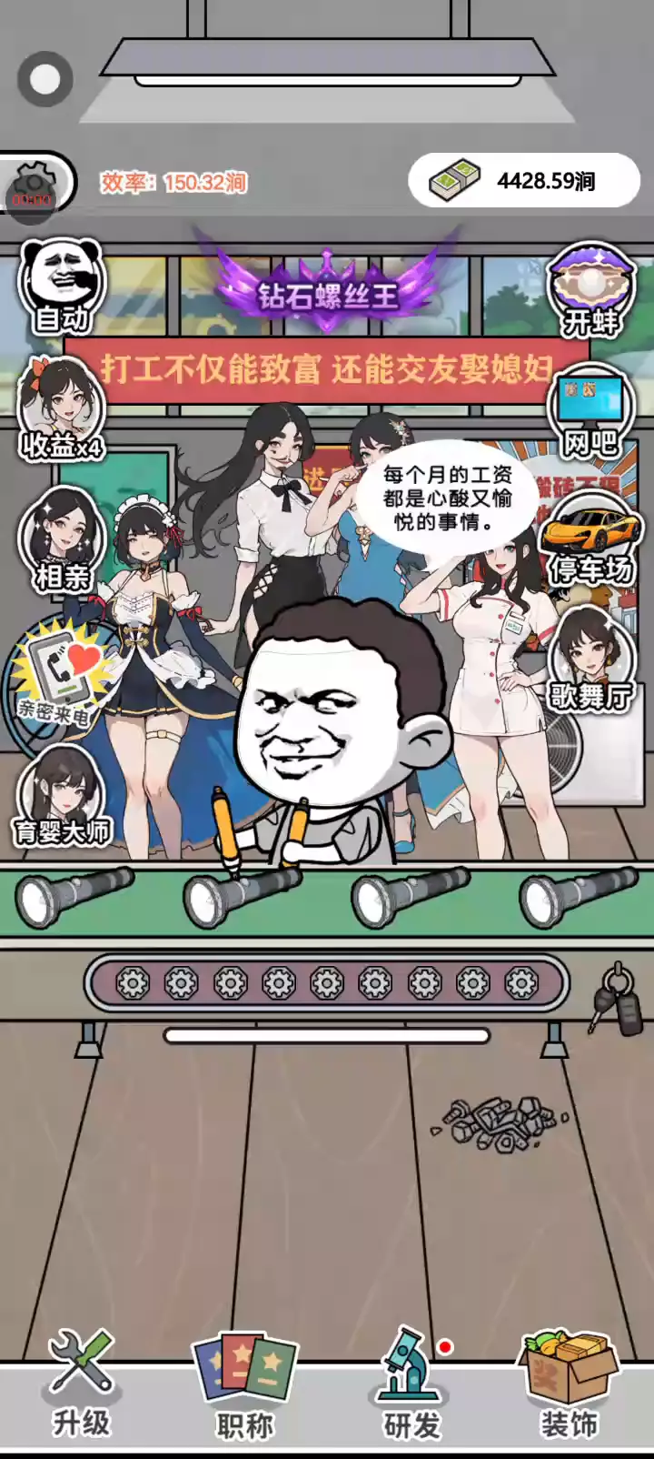 疯狂打螺丝是一款废柴工厂打工逆袭的模拟经营小游戏,玩家通过点击屏幕打工赚钱,通过pk获取更高职称,养家糊口走向人生巅峰