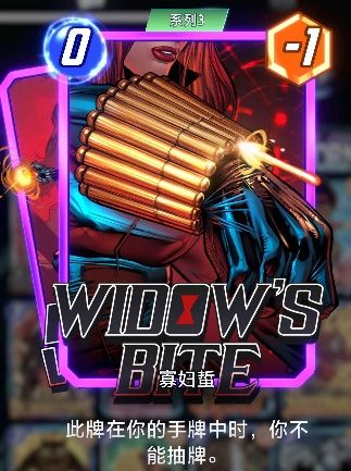 在游戏中,他拥有3-3的身材,能力:揭示:将1张寡妇蜇添加到对手手牌。寡妇蜇:身材0--1,此牌在你的手牌中时,你不能抽牌。黑寡妇是3池卡,入手难度较高,一般配合黑鹰等中速控制卡组使用,给对手添加寡妇蜇卡对手抽牌,随着黑鹰的削弱现在也成为时代的眼泪,对比白寡妇各方面被完爆,新手不推荐,卡牌强度推荐指数:4.5分