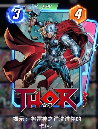 在游戏中,他拥有3-4的身材,能力:揭示:将雷神之锤洗进你的卡组。雷神之锤:身材0-0,揭示:索尔+6战力。雷神是3池卡,入手难度较1池卡会高很多,配合马面雷神、女雷神、奥丁等众多卡牌使用时卡牌战力上限一般可达10或16,但较吃排序,新手在缺卡的情况下不推荐,卡牌强度推荐指数:5.5分。