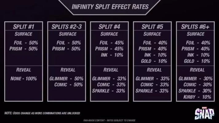 当你获取了卡牌与变体后便可用蓝点与粒子进行升级,升至无限后便可以进行一次卡牌分裂,分裂会为该卡牌添加新的背景与粒子特效。其中背景特效分为4类:闪箔,棱镜,墨色,炫金。粒子特效分为四类:格调,微光,星尘,爆裂。每种粒子特效又有如下颜色:黑、彩虹、金、紫、红、蓝、白、绿。各种背景及粒子特效分裂概率如下: