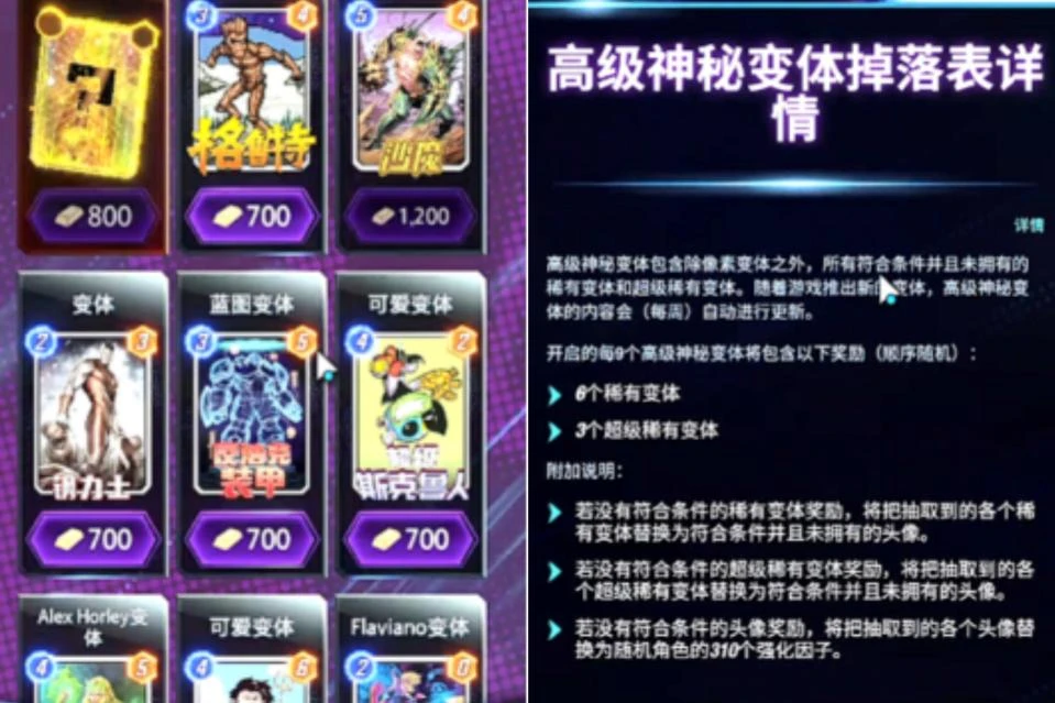 稀有变体与超级稀有变体可通过商店每日刷新购买。而终极变体在代币商店8小时轮换一次。终极变体目前并无特效(特效还在设计师画的饼里),除非特别喜欢不建议购买,因为5000代币真的太贵了。值得一提的是,如你通过礼包等途径获取了还未拥有卡牌的变体时,你是可以使用该卡牌的,但在后续开箱过程中依然会开出其本体。